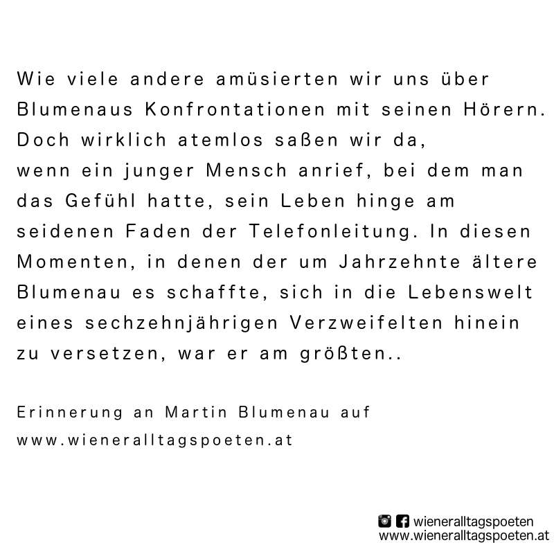 Es war dies die Hochzeit einer Radiostation, deren Gründungspersonen (mein Podcast mit Clemens Haipel zum Nachhören) auch heute noch zu den interessantesten Persönlichkeiten in der österreichischen Medienlandschaft zählt. Martin Blumenaus Fehlen hatte sich schon lange vor seinem Ableben angedeutet, auch auf seinem eigenen Sender, auf dem das neu gecastete Personal sich schwertat, die großen Fußstapfen auszufüllen. Zu oft fehlte dieses Kratzen, das Widerständige und man war so froh, wenn man aufdrehte, und ganz zufällig doch wieder einmal Blumenaus Sendung erwischte. Sie schien mittlerweile fast aus der Zeit gefallen, mit seiner Bereitschaft, Sendezeit zu füllen, ohne sich die eigenen Worte selbst vorzuschreiben. Ich weiß jetzt schon, dass ich auch in Zukunft wenn ich das Radio aufdrehe immer noch diese leise Hoffnung haben werde, dass er nicht doch mal wieder eine Sendung macht und ich genau zum richtigen Zeitpunkt einschalte.